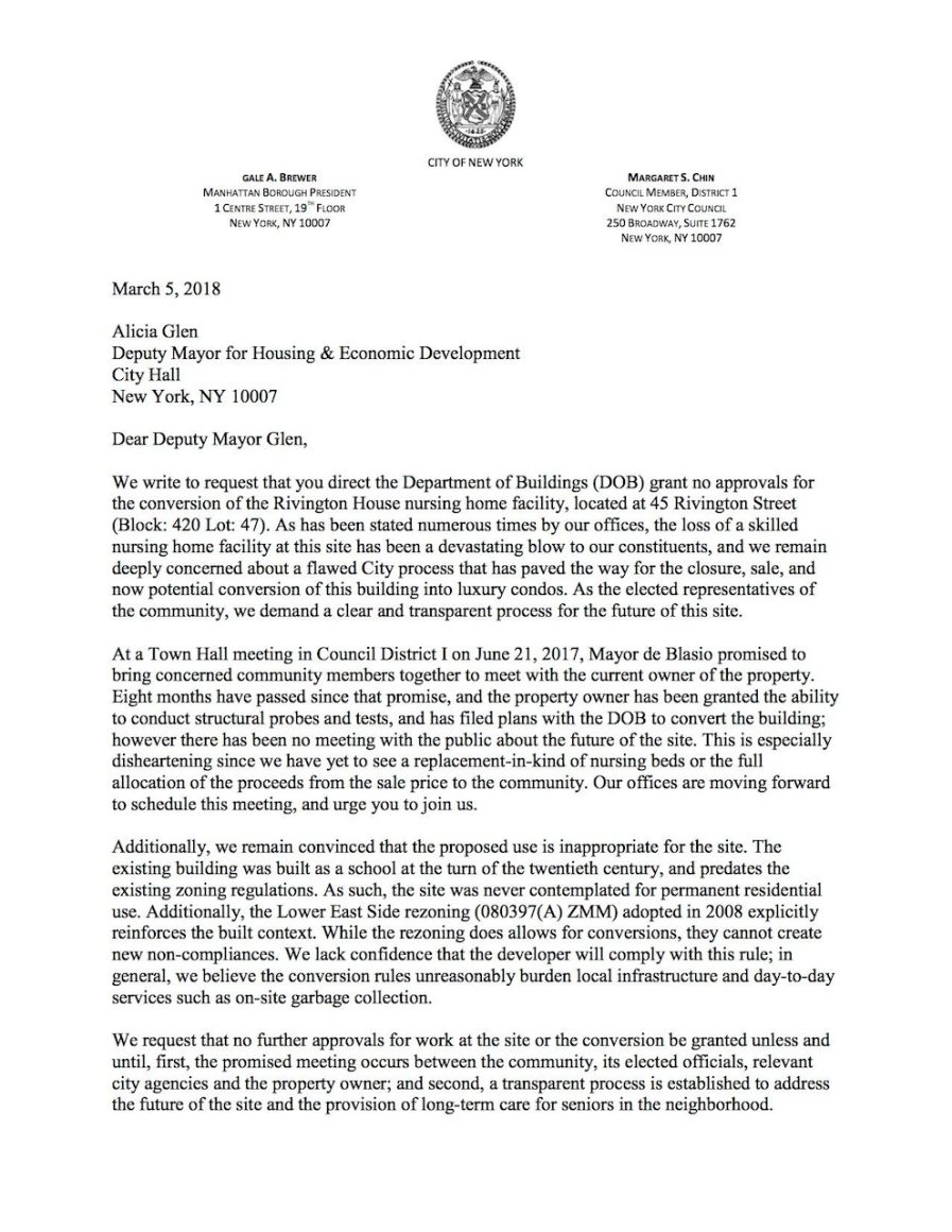 During a town hall meeting in June of last year, de Blasio reluctantly agreed to set up a meeting between the new owners and concerned members of the community about potentially creating a new community facility in the building. The mayor has repeatedly called his administration’s decision to lift deed restrictions at Rivington House a mistake, but has contended there’s no legal way to take the building back from private owners. Brewer and Chin wrote: