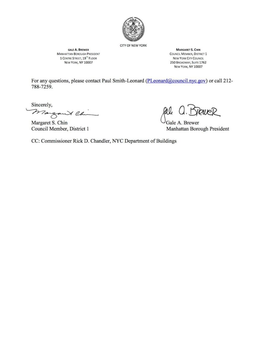 Earlier this week, they got a boost from Manhattan Borough President Gale Brewer and City Councilmember Margaret Chin. The elected officials Monday sent a letter to Deputy Mayor Alicia Glen, urging her to put a hold on any DOB permits at 45 Rivington St. Here’s part of that letter:
