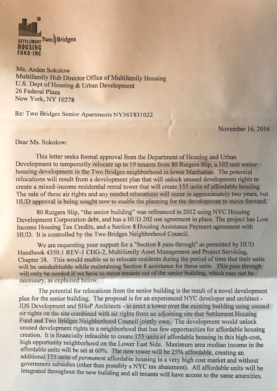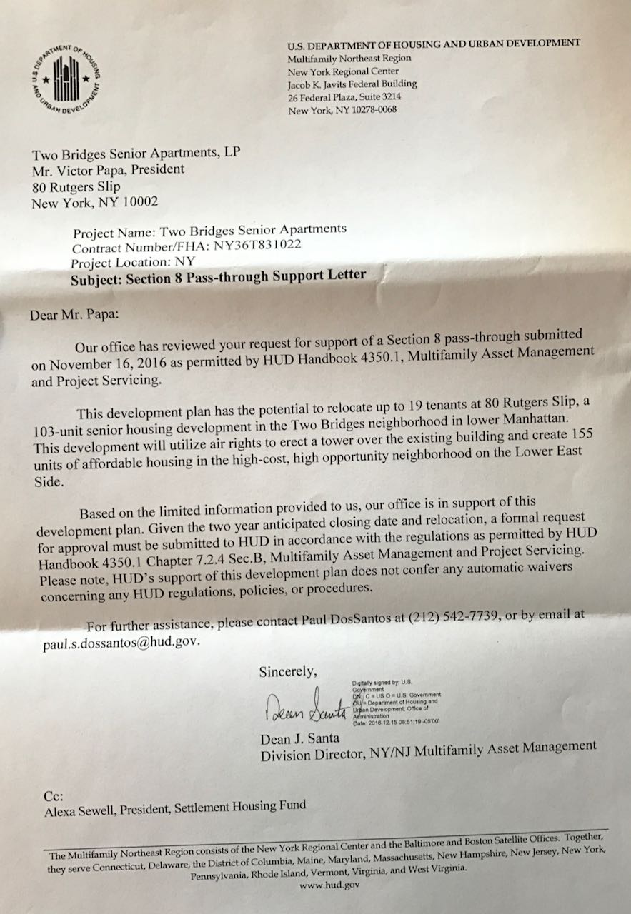 JDS Development Group has publicly acknowledged that it might be necessary to move some tenants of a low-income senior housing complex at 80 Rutgers Slip. Plans call for the tower at 247 Cherry St. to be built over the senior building. The Lo-Down has learned new details about the proposal as the result of a Freedom of Information Act request filed in early January. The documents we obtained show that the U.S. Department of Housing & Urban Development offered its support for the plan in a letter dated Dec. 15.