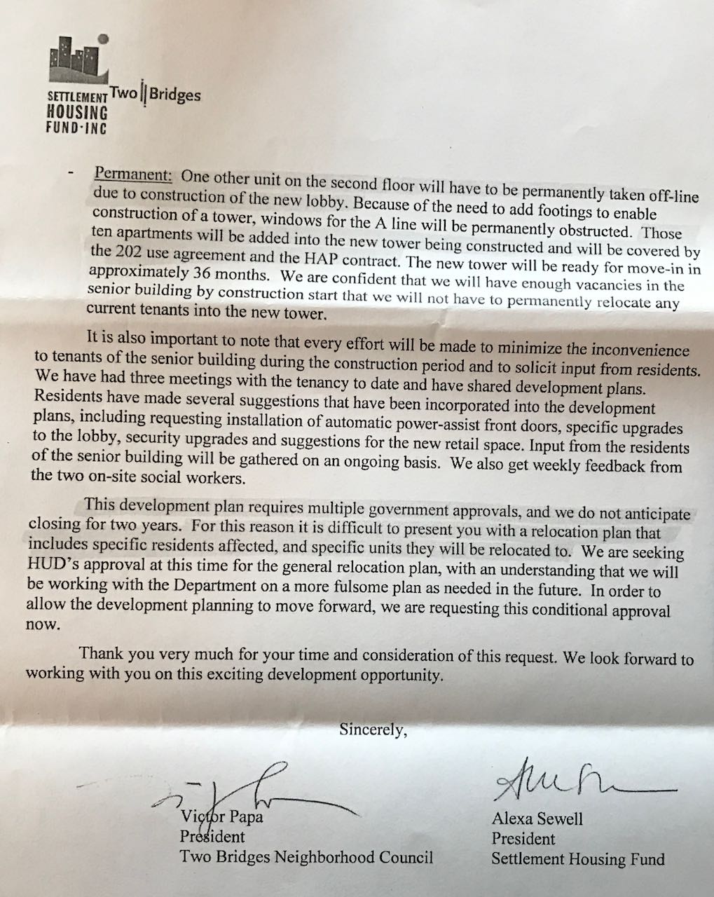 This week, in response to repeated requests for information on the senior relocation plan, a representative of Two Bridges/Settlement Housing Fund responded to my office that they didn’t ‘have anything written.’ That response, we now know, was completely untrue. Furthermore, this communication between Two Bridges/SHF and HUD shows that the development team has, on numerous occasions, deliberately misled residents about the senior relocation plan for 80 Rutgers. Today, I plan to make my opposition known to HUD, Two Bridges/SHF, and the development team, and to focus on community priorities and ways to achieve those priorities by any means necessary.