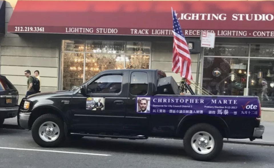 Wong is a well known figure in Chinatown. He was a leading operative in Chin’s 2009 campaign, but turned on her four years later, supporting candidate Jenifer Rajkumar. At a candidate debate we attended in the weeks leading up to this year’s primary, Wong was heckling Chin from the audience. You may have seen (or heard) him in the days before the primary tooling around in this tricked out truck, which was blaring pro-Christopher Marte messages on a loudspeaker.
