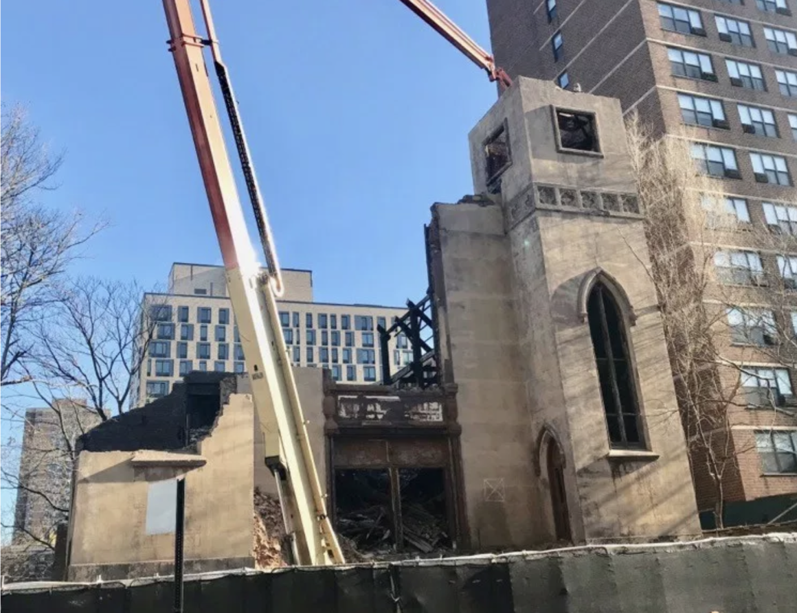 As we have previously reported, a development plan is in the works on a parcel behind Beth Hamedrash Hagadol at 50 Norfolk St. It’s owned by the Chinese American Planning Council. The new residential tower is being developed by the Gotham Organization, utilizing air rights from the synagogue. Workers have partially demolished Beth Hamedrash Hagadol, which was ravaged by fire in May of last year.