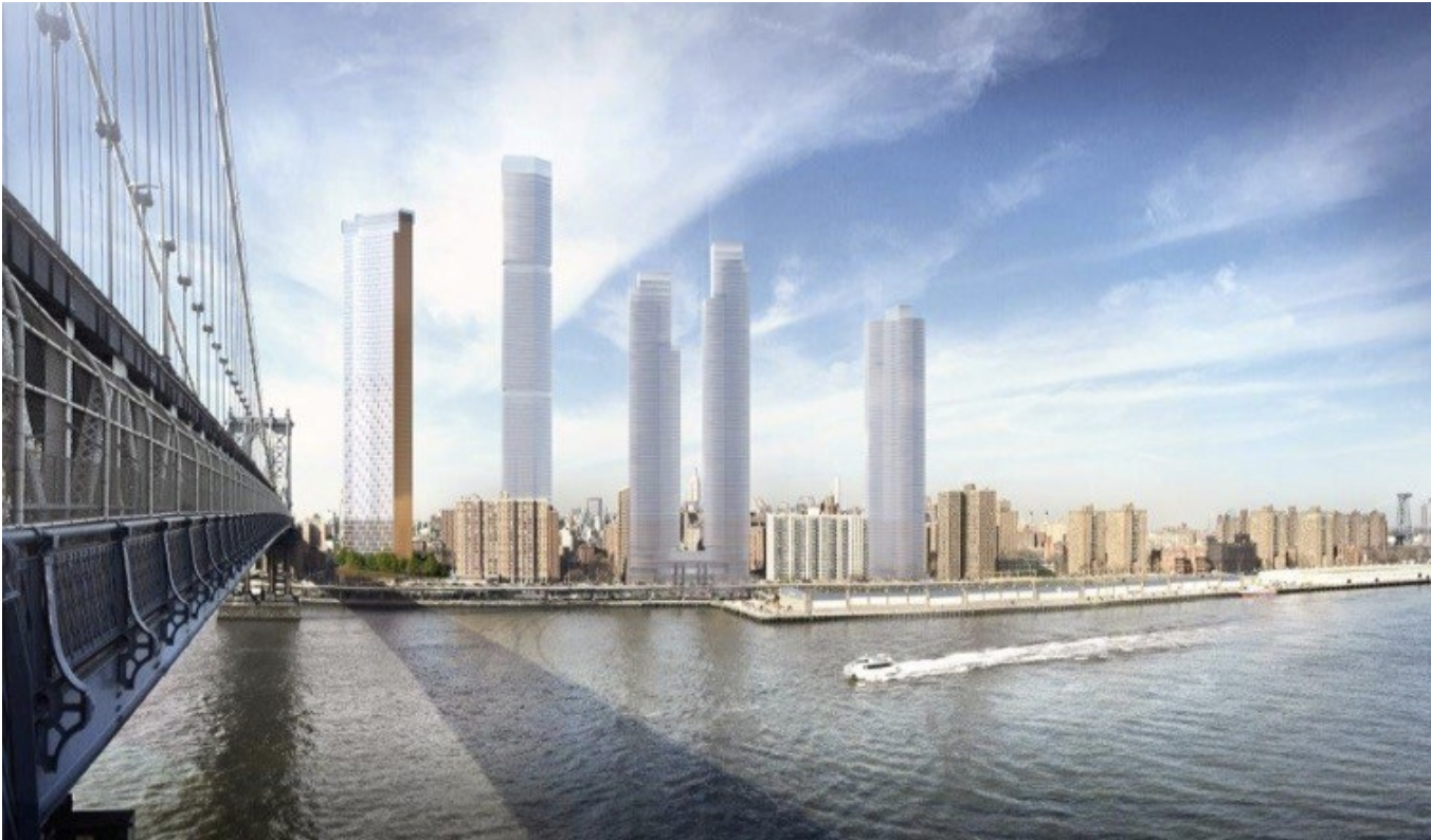 In December, the City Planning Commission approved the plans in spite of strong community opposition. The projects would add 2,775 mostly market rate rental units along the historically low-income waterfront. 694 apartments (25%) would be designated as permanently affordable. The developers are JDS Development Group, a partnership between L+M Development Partners and the CIM Group and The Starrett Group. The towers will range in height from 63-80 stories.