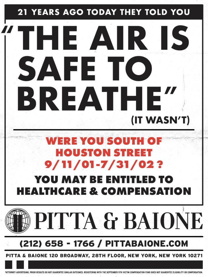 21 years ago today they told you “The air is safe to breathe.” (It wasn’t) Were you south of Houston Street between Sept. 11, 2001 – July 31, 2002? You may be entitled to healthcare and compensation.