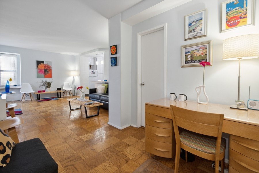 This beautifully renovated studio in the Seward Park Cooperative is the perfect place to call home, either full or part-time! At approximately 500 sq. ft. it is not lacking in size. The main living area is well proportioned and cleverly laid out and furnished to maximize the space. It can even be set up to have distinct areas for sleeping, living, and dining. Further enhancing the space, the kitchen has wall was opened toward the living area and has been renovated to include sleek, white cabinetry, countertops, blue subway tile backsplash, tiled floors, and full-sized appliances (including overhead microwave). Opposite the living area is a sizeable foyer (with closet) that can double as office space and leads to a private dressing area, renovated bathroom with deep soaking tub, and 2 additional oversized closets. Beautifully refinished parquet flooring throughout.