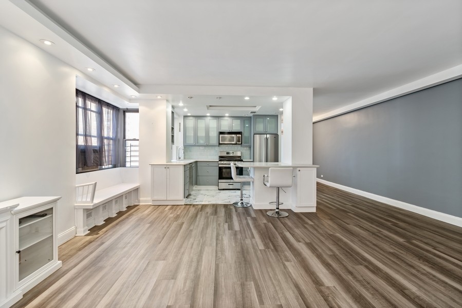 The windowed bathroom has been elegantly updated with floor to ceiling tiling, recessed shelving, sleek vanity with a mirrored cabinet above. Other nice touches throughout the apartment include a cozy window nook in the living room, recessed lighting, updated molding, plank flooring, and 2 additional deep cosets upon entry.