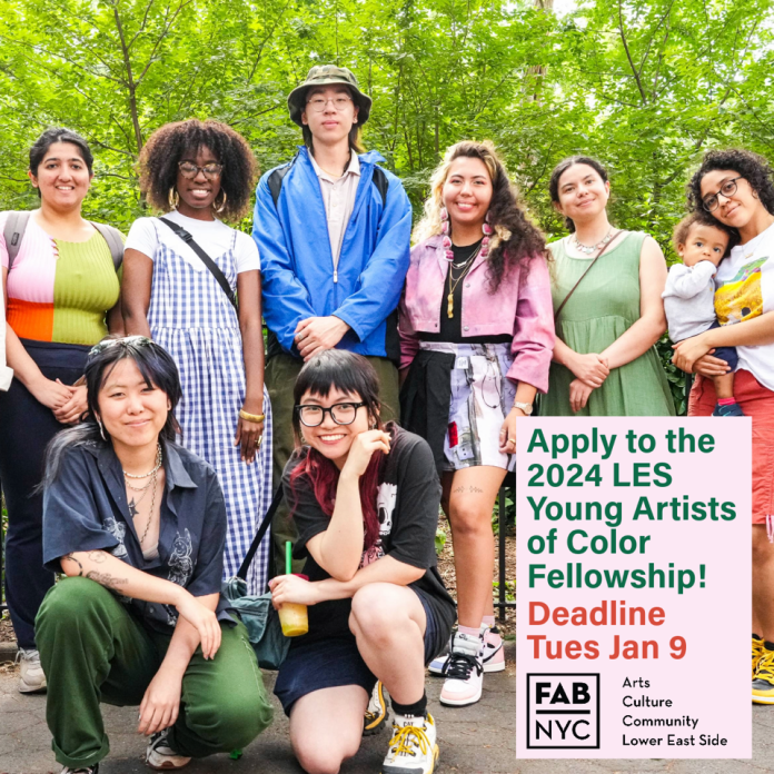 Proposals are being accepted now through Jan. 9, 2023 for FABnyc’s Lower East Side Young Artist of Color Fellowship. To be eligible, you must be an artist of color between the ages of 18 and 26. The organization will accept 8 fellows for Spring 2024. Artists in any discipline may apply.