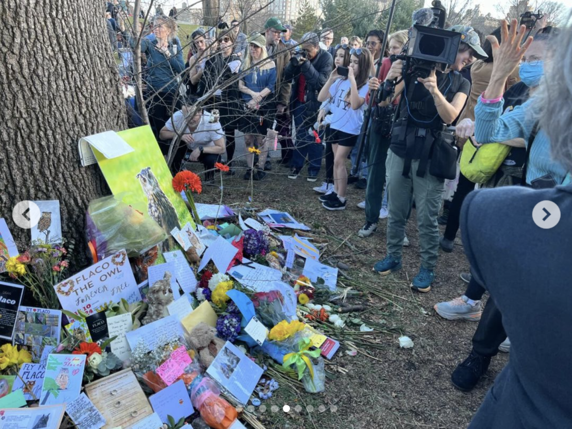Flaco met a sad demise when he flew into a tall building on the Upper West Side on February 23rd. Mourners and fans gathered for a memorial tribute in Central Park yesterday. Author and local resident Laurie Gwen Shapiro was on the scene for the event.