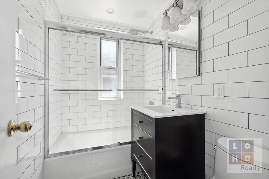 The windowed bathroom has been renovated top to bottom with sleek white subway tile, updated vanity, medicine cabinet and a shower/deep soaking tub with glass enclosure. The bedroom is quite spacious with room for a king-sized bed, dresser, end tables and more! four (4) closets (including walk-in in bedroom), 8’2” ceilings and hardwood parquet flooring throughout.