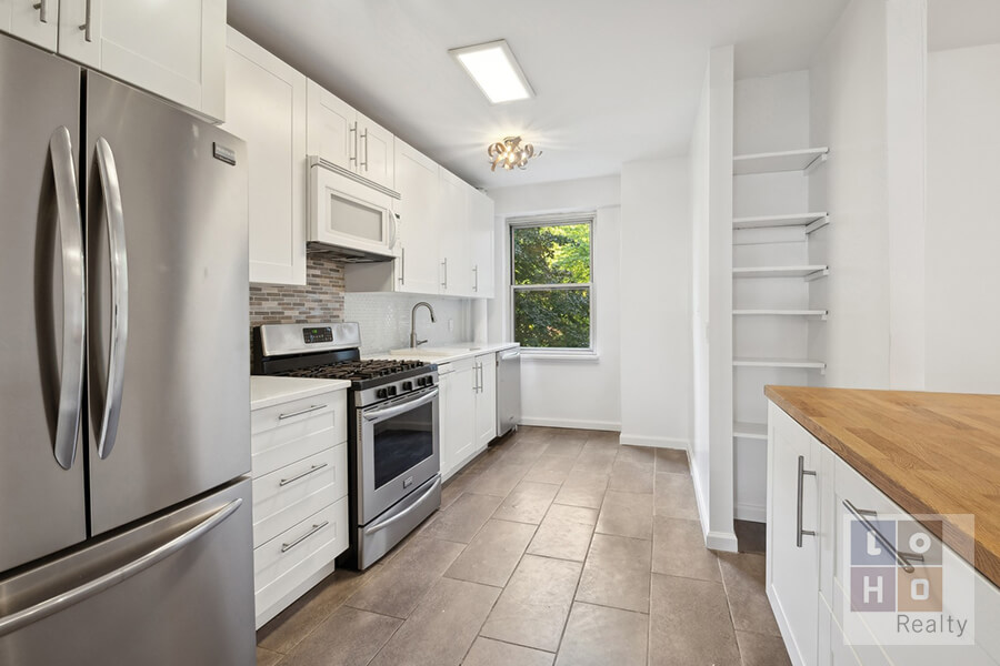 Opposite the living room is the renovated kitchen, complete with an abundance of sleek white cabinetry, quartz countertops, glass tiled backsplash, vinyl grouted flooring and updated appliances (including dishwasher). The wall separating the living room from the kitchen has been removed and a pass-through to the foyer/dining area was created, creating an expansive space further enhancing the apartments natural light & airflow through the unit’s double exposures (east & west).
