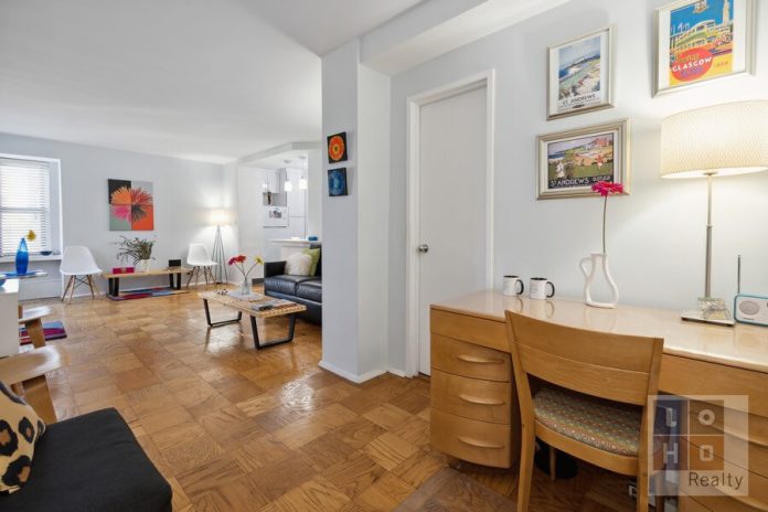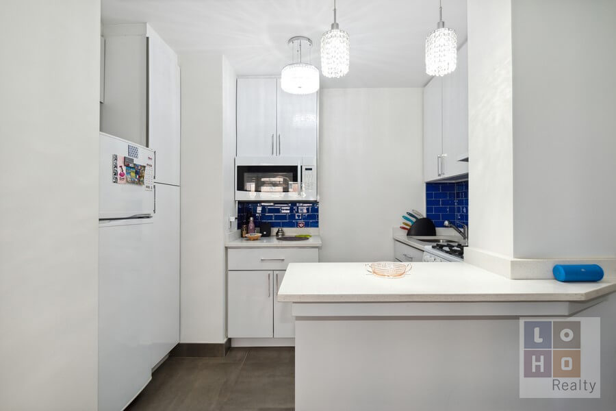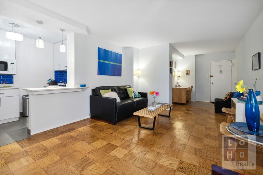 Further enhancing the space, the kitchen has wall was opened toward the living area and has been renovated to include sleek, white cabinetry, countertops, blue subway tile backsplash, tiled floors, and full-sized appliances (including overhead microwave). Opposite the living area is a sizeable foyer (with closet) that can double as office space and leads to a private dressing area, renovated bathroom with deep soaking tub, and 2 additional oversized closets. Beautifully refinished parquet flooring throughout.