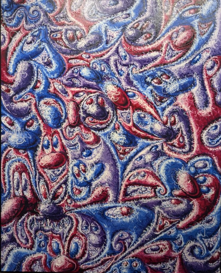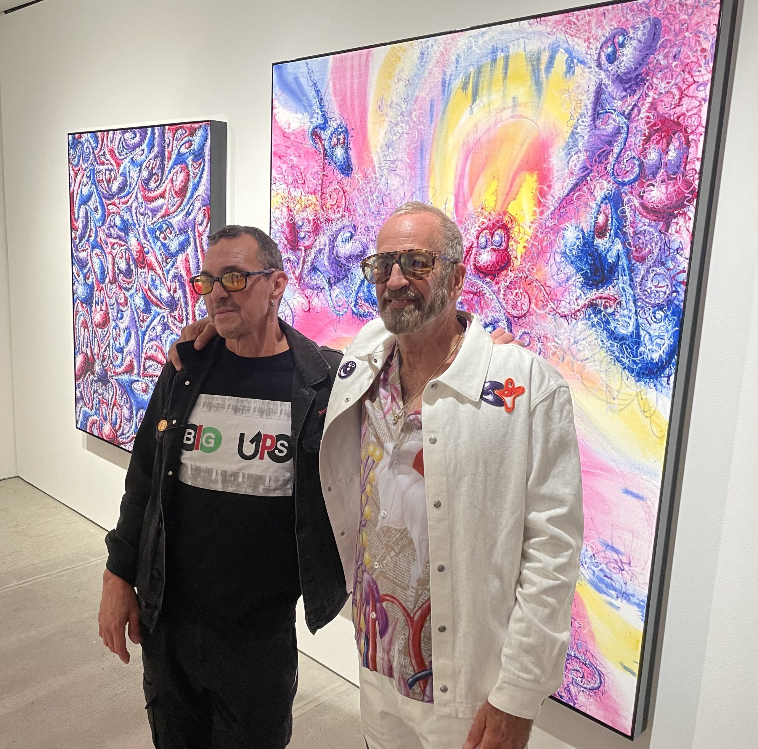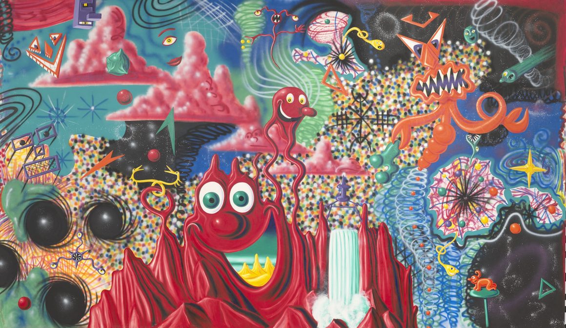 The works on offer at Totah, which have six-figure price tags, were mostly painted this year, but they all are done in Sharf’s signature style, they are masterworks of space-age surrealism, with smiling blob figures racing about, or engaging with viewers from psychedelic netherworlds and swirling, tie-dyed universes. Like all of Scarf’s oeuvre, these new works absolutely refuse to stand still.