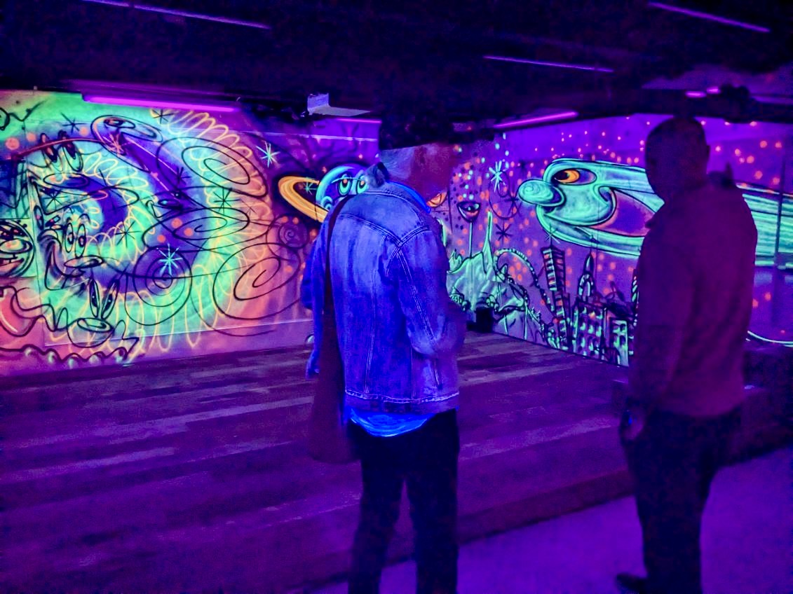 As a further homage to the 80’s scene, Scharf transformed the basement of the gallery into an immersive black-light and day glow Cosmic Cavern like those he created at countless locations over the years, from the loft he shared on 39th St. with Haring, to the essential avant-garde EV art showplace Fun Gallery, to the Whitney and MoMA.
