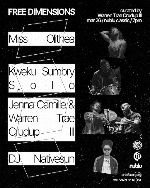 Our friends at Arts For Art have been curating a weekly experimental/free-jazz concert series every Wednesday called Free Dimension. They write, “It is a unique, underground scene taking place at the NuBlu Classic in alphabet city. We hope to further create community and bring this historical genre of music to a wider audience.”