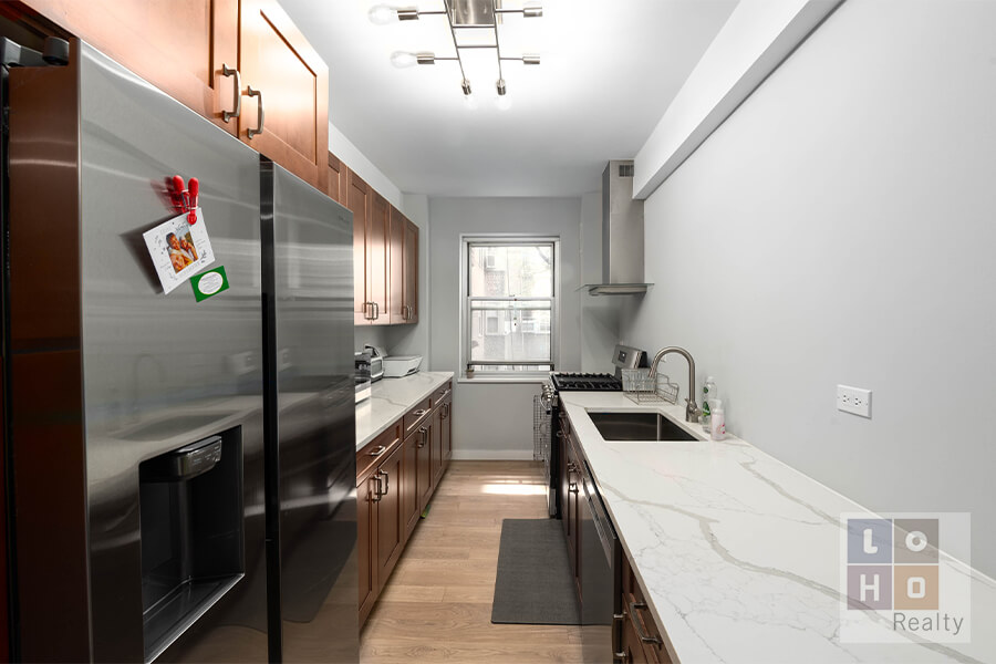 Welcome to this thoughtfully updated home located in one of Manhattan’s most vibrant neighborhoods. A spacious foyer opens into a generously sized living room, separate dining area, and a true cook’s kitchen — perfect for both everyday living and entertaining. The windowed kitchen is outfitted with an abundance of wooden cabinetry, sleek quartz countertops, and a full suite of stainless-steel appliances, including a dishwasher. A frosted glass door leads to the renovated bathroom, featuring classic white subway tile, recessed shelving in the bathtub/shower, a new vanity and sink, oversized mirrored medicine cabinet, and a window for natural light.